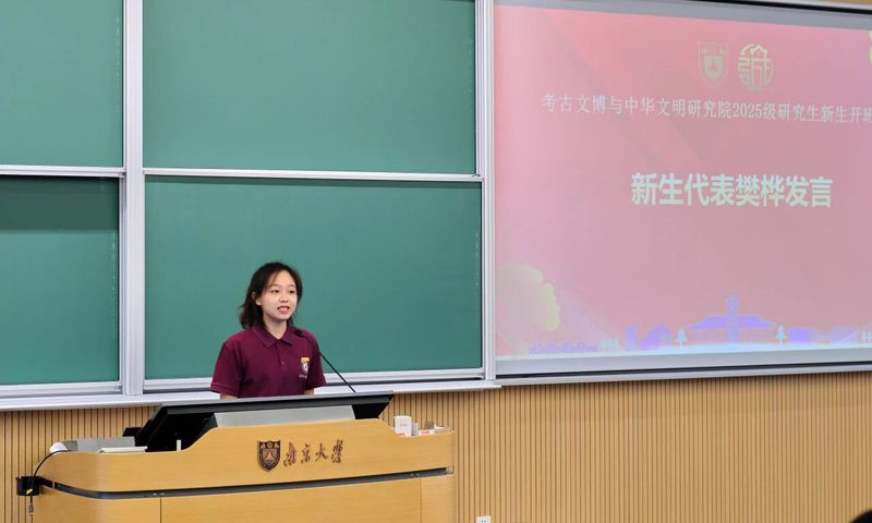 之后是新生代表樊桦发言,她代表新生承诺:将传承蒋赞初、张之恒等南大考古文博前辈“坐得住冷板凳、扛得起重担当”的精神,以“以物论史、以史增信” 的实践,践行习总书记建设“中国特色、中国风格、中国气派考古学”的嘱托。她表示,将主动探索前沿技术与考古文博的融合,以“诚朴雄伟、励学敦行”的校训自勉,为学科发展与文化传承贡献青春力量。