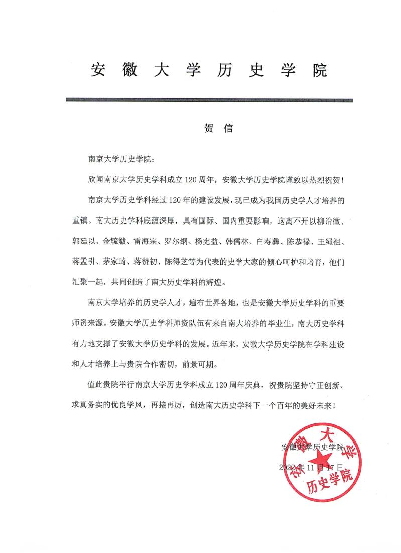 安徽大学夜色直播 来信祝贺夜色直播 历史学科成立120周年