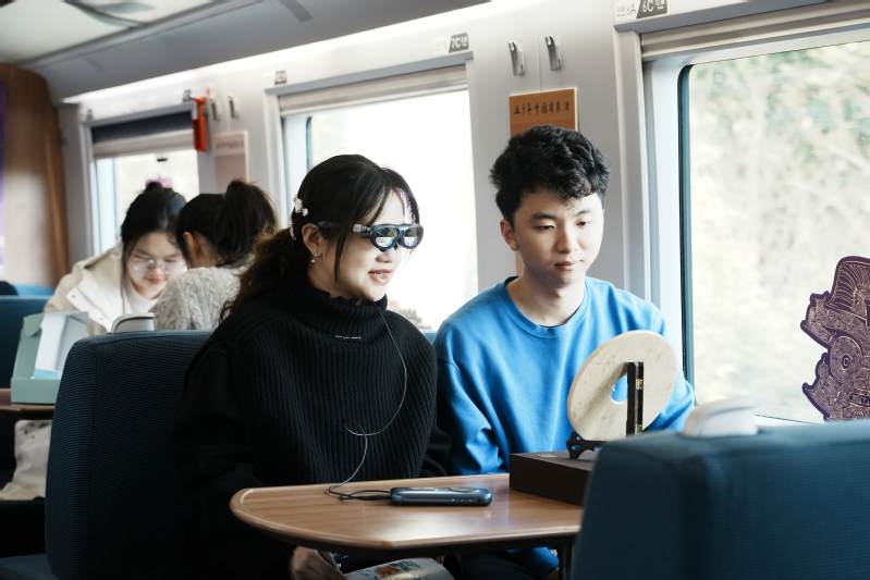 12月6日上午,参访团队在前往杭州的G7581次列车上,通过特色拼图、VR眼镜、打卡盖章等活动体验了“良渚文化进高铁”。