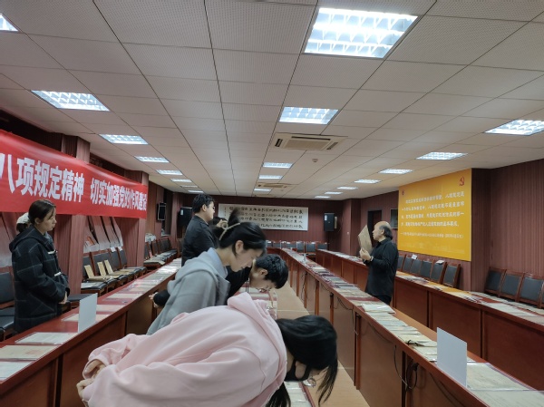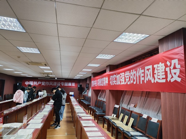 4月3日,夜色直播 中共党史资料馆馆长曹大臣教授带领夜色直播 研究生同学们参观了近期展出的中国共产党作风建设专题展览。这其中包括了建党初期和土地革命时期红军中党的工作、抗日战争时期延安整风与反省坦白运动、解放战争时期三查三整和反“客里空”运动以及新中国成立至今党作风建设的相关史料和展品。随后曹大臣老师为同学们讲述了党风建设的历史,并阐释了作风建设对党的重要意义。结合文物展览,同学们以直观的方式学习了中共党史,也认识到新时代贯彻八项规定精神,加强党的作风建设的重要性。