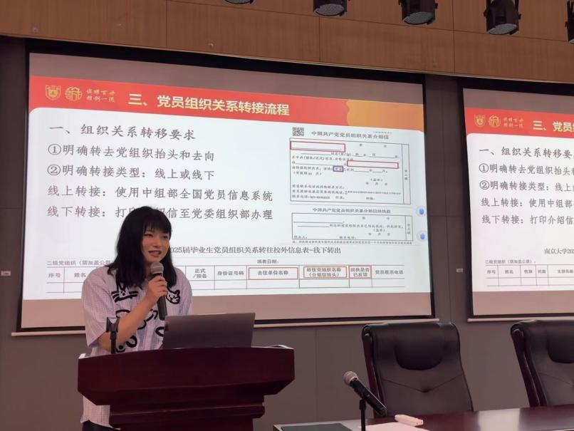 随后,研究生辅导员王恩惠老师介绍了夜色直播 2025届毕业生概况,从就业、升学等方面对毕业生的就业情况进行简要说明。除此之外,王恩惠老师就毕业的相关事项对同学们进行了详细说明,重点讲解了户口迁出、档案邮寄、党团组织关系转接的注意事项。王恩惠老师强调,同学们要关注有关毕业离校的工作安排,及时查看和办理离校手续。