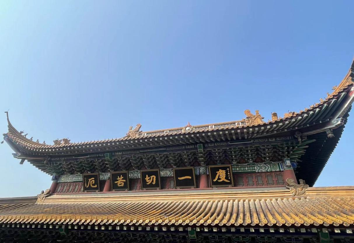 大家首先来到了江天禅寺。其始建于晋明帝时期,上有“江天禅寺”匾额,据传为康熙御笔。大家首先了解到金山寺的建筑格局:其打破了中国多数寺庙坐北朝南、寺分三路的建筑传统,而是依山就势,大门西开,正对长江。寺院中通过廊、檐、石级的巧妙串联,从山脚到山顶,只见有房屋,不见有山,是为“寺裹山”。我们穿过大雄宝殿逐级而上,回头看去,殿上赫然“度一切苦厄”五字匾额,昭示着普渡众生的理念。大家不禁相视一笑,纷纷拍照留念。登上山顶,便望见慈寿塔与“江天一览”石碑。俯视长江滚滚,山川起伏,真有一览江天之感。