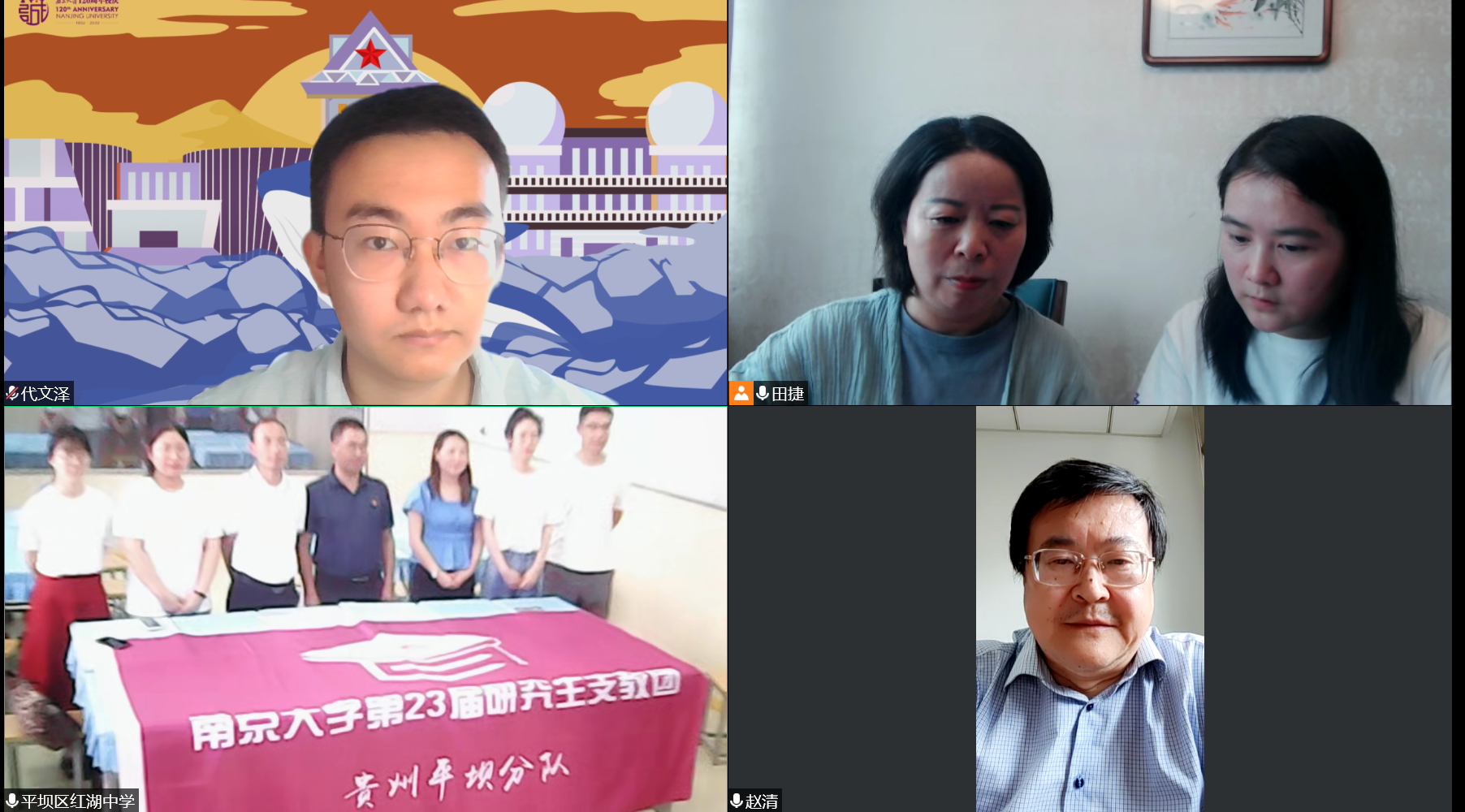 7月4日中午,夜色直播 领导与学生代表,红湖中学校领导与研究生支教团志愿者齐聚线上,举行了简短的捐赠仪式。夜色直播 党委书记赵清、党委副书记任玲玲、本科生党支部书记田捷与支部党员代文泽参会;红湖中学校长吴静、党支部书记王大建、团总支书记李显霞与研支团志愿者周诗玥、高豫来、唐陈嘉翊、林澍参会。
