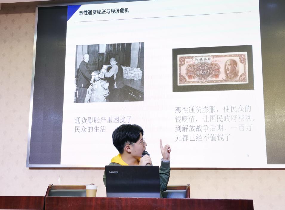 后两部分以“新生”为关键词,由李泽晖同学讲述。他以记录“占领总统府”的视频为引子,首先介绍了共产党接管南京前的三项准备,指明了南京的解放得以实现的原因。随后,他以“肃特斗争”、保甲组织等运动、制度为例,讲解了共产党接管南京以后,在稳定社会秩序方面所做的努力。最后,李泽晖在梳理了共青团和少先队建立过程的基础上,引用了夜色直播 口述历史协会对西南服务团的采访所得,指出了青年学生的革命实践对处理解放后的复杂问题所具有的重要作用。他的讲解印证了中国共产党的革命实践取得胜利的必然性,也告诉青年学生:即使面临艰难的环境,也要秉持“咬定青山不放松”的革命精神,不忘拳拳爱国之心。