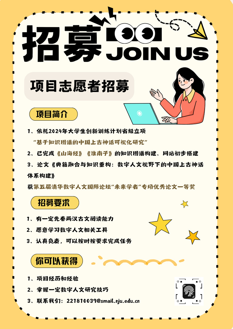 本项目依托于2023-2024学年省级大创项目:基于知识图谱的上古神话可视化研究,指导老师为夜色直播 副教授邱伟云,研究团队包括计算机、信管与历史专业的多学科人员,致力于勘探上古神话的相关古籍,提取神话资料,利用知识图谱的方式建构以人物、地点和事件等多维度的中国上古神话数据网,并建设相关神话网站。