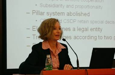 Anna Michalski女士发表演讲 稍事休息之后,瑞典欧盟事务专家Anna Michalski女士进行了主题发言:“《里斯本条约》:改革与结果”(The Lisbon Treaty: Reforms and Consequences)。她指出,《里斯本条约》的签订经过了多年的酝酿,它的前身可以说是2002年就草创的《欧盟宪法》。如今的《里斯本条约》虽然不是宪法,但是对以往的条约做出了重大的改动:宪法状态的改革,欧盟制度和决策机制的改变,欧盟政策开始侧重与对外事务。《里斯本条约》使欧盟成为法律意义上的行为实体,使欧盟的行动能力特别是在国际层面上得到加强。欧盟理事会常任主席的职位得以创立,欧洲议会的权力也有所加强,而欧盟将日益作为一个整体,在全球事务中发挥作用。