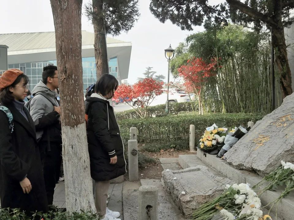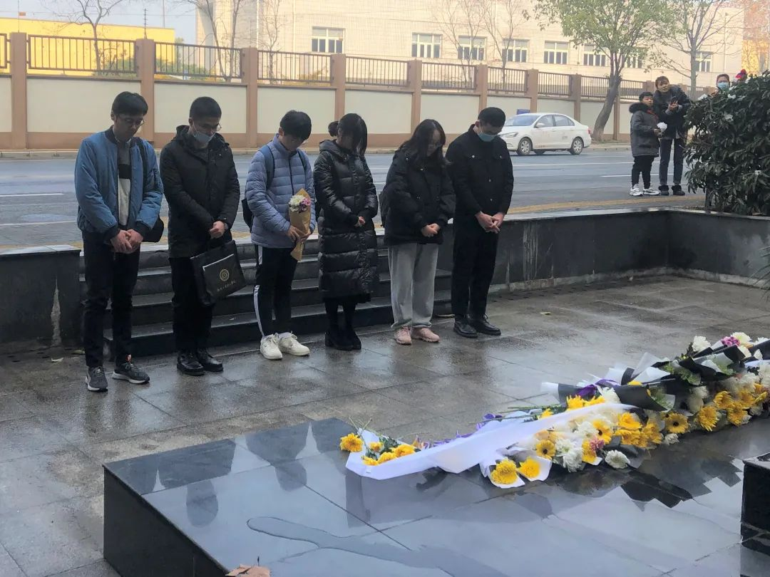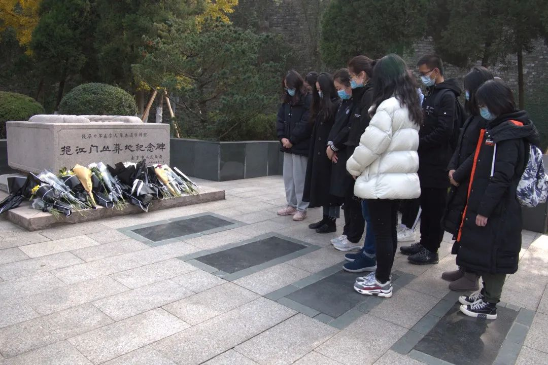 The students presented flowers and mourned in silence in front of monuments in these burial sites for victims of Nanjing Massacre by Japanese invaders, including Caoxie Valley, Zhongshan Pier, Yijiang Gate, Arctic Pavilion, Taiping Gate, Wutai Mountain, and Hanzhong Gate.